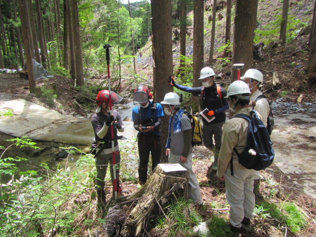 作業の効率化を図る技術や道具の導入も積極的に行っています。写真は森林研究所の古川氏が推奨するGNSSの精度を検証している様子。